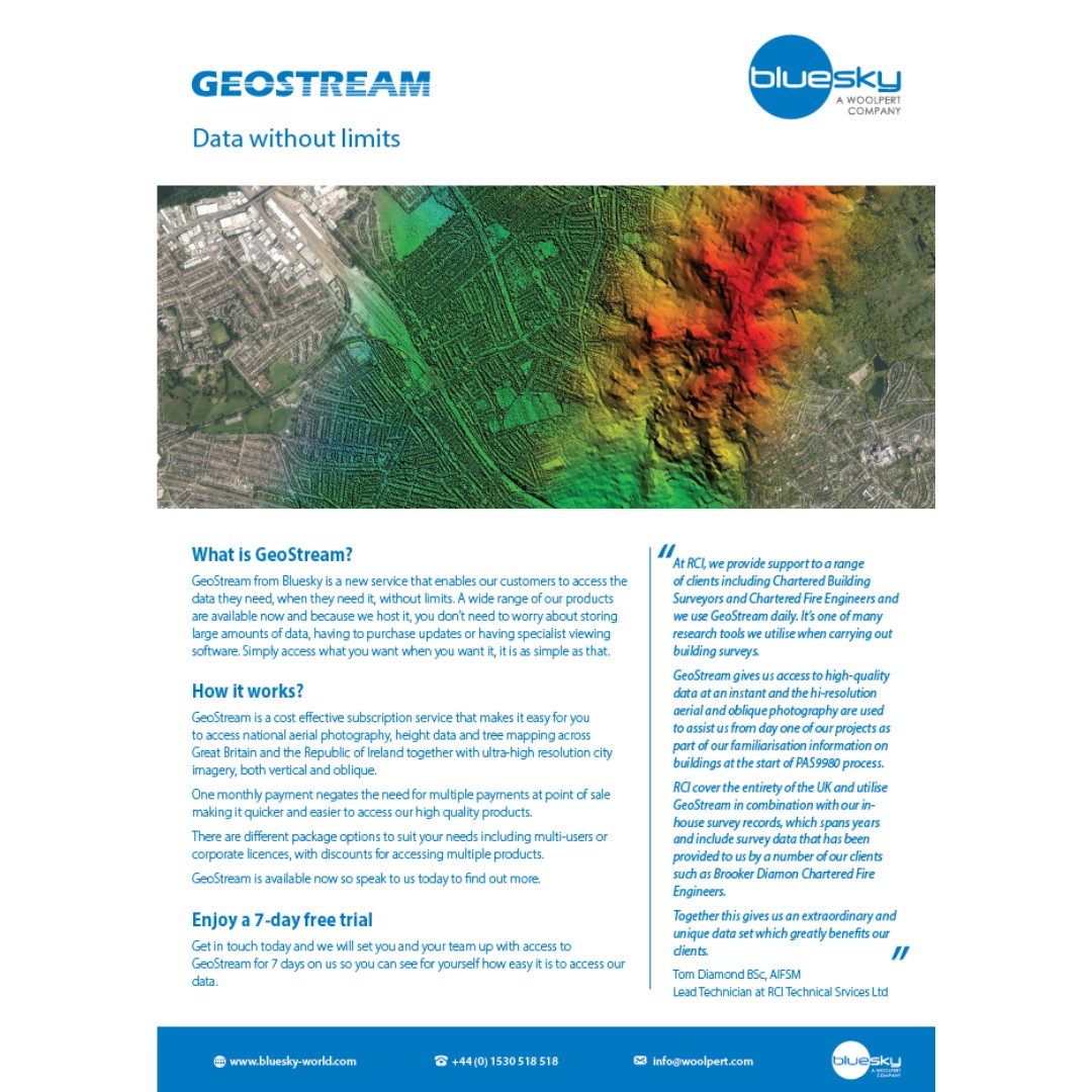 As a recognised specialist in the acquisition and processing of aerial photography and LiDAR, Bluesky uses the latest technology and an experienced technical team to produce innovative off-the-shelf and tailored products to meet the needs of organisations in a range of market sectors. The datasheets below contain technical specifications of Bluesky’s core products and their applications.